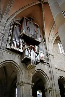 The cathedral has a choir at each end. The eastern choir is the oldest part of the cathedral, still in pure Romanesque style. The western choir is early Gothic and its vault was built from 1232.[1]: 205