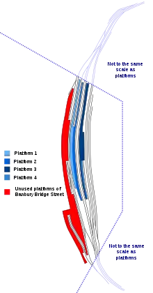 Many redundant loops and sidings surround the station: most of these were for goods services stopping at Banbury, which have all disappeared. Two goods loops survive to allow the stoppage of goods trains for the uninterrupted passage of passenger trains.