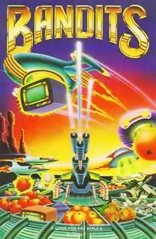Bandits is a 1982 fixed shooter written by Tony and Benny Ngo for the Apple II and published by Sirius Software.[2] The game is a clone of Taito's 1980 Stratovox arcade game where the goal is to prevent aliens from stealing objects. Bandits was ported to the Atari 8-bit family,[3] Commodore 64, and VIC-20.