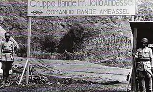 Locally recruited bands were employed in the conquest of Italian Libya from 1911 to the 1930s. Their Somali counterparts played an important role in Italian Somaliland during the 1920s.[1] In Italian Somaliland, the Italians also employed Dubats; levies that were maintained on a permanent basis and were better trained and equipped than the Banda. During the guerrilla war that continued in Ethiopia after the 1936 Italian invasion, Banda were recruited amongst groups collaborating with the Italian regime. One of the best known of these was the Gruppo Bande irregolari "Uollo Ambassel" in northern Ethiopia.