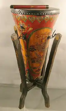 The bangu (Chinese: 板鼓; pinyin: bǎngǔ), often simply gu (Chinese: 鼓; pinyin: gǔ), is a Chinese frame drum that, when struck by one or two small bamboo sticks, creates a sharp dry sound essential to the aesthetics of Chinese opera. Striking the drum in different places produces different sounds. It is also used in many Chinese chamber music ensembles. The percussion section is very important in Chinese Opera, with battle or 'martial' scenes, which are called wu-chang. The bangu player is the director or conductor of the orchestra. He works with the other members of the percussion section to create the right mood for the audience and actors on stage.