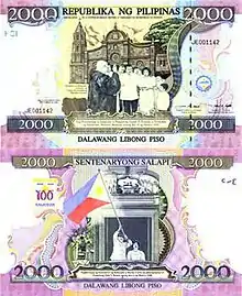 | ₱2,000 | 216 mm × 133 mm | Blue and violet | President Joseph Estrada taking his oath of office on June 30, 1998, in the historic Barasoain Church, the seat of the first democratic republic in Asia shown in the background as well as the scroll of the Malolos Constitution and the seal of the BSP (Bangko Sentral ng Pilipinas) | Re-enactment of the declaration of Philippine Independence led by President Fidel Ramos at the Aguinaldo Shrine in Kawit, Cavite on June 12, 1998, Philippine Centennial Commission logo | 1998 | August 1, 2019 | |||