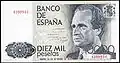 | 10,000 | 165x85 | Juan Carlos I at right; Felipe, Prince of Asturias at left, view of the Escorial at center on the reverse | 24 September 1985 | ||