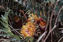 Banksia drummondii, commonly known as Drummond's dryandra,[2] is a species of shrub that is endemic to Western Australia. It has pinnatifid to pinnatisect leaves, heads of up to one hundred cream-coloured, red and yellow flowers and glabrous fruit.