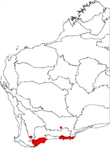 B. nutans grows along the south coast of Western Australia between Albany and Cape Pasley. There are two main centres of distribution: between Albany and Hopetoun and between Scaddan and Cape Pasley. The intervening area has been largely cleared for agriculture, and B. nutans is not known to occur there. There are also some outlying populations: populations of B. nutans var. cernuella have been recorded in the vicinity of Arthur River, and the Western Australian Herbarium has recorded B. nutans var. nutans from around Norseman.[13][14]