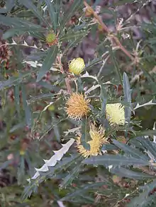 Banksia squarrosa, commonly known as pingle,[2] is a species of prickly shrub that is endemic to Western Australia. It has linear to narrow lance-shaped leaves with up to ten sharply-pointed teeth on each side, yellow flowers in heads of about sixty and later, up to seven oblong to egg-shaped follicles in each head.