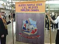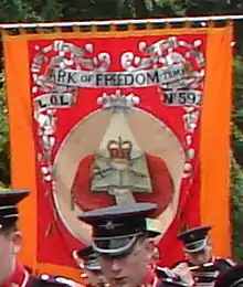 Banners are a significant part of the Culture of Northern Ireland, particularly for the Protestant/unionist community, and one of the region's most prominent types of folk art. They are typically carried in parades such as those held on the Twelfth of July, Saint Patrick's Day and other times throughout the year. Generally these are organised by societies such as the Orange Order, the Ancient Order of Hibernians, the Royal Black Institution and the Apprentice Boys of Derry, and the banners are typically commissioned, and represent, a lodge within one of these societies. Banners are also carried by trade unions and church groups, and by marching bands. Most banners are painted by professionals and executed on silk, although canvas was a more popular material in the past. Most have a painting on each side, usually depicting different subjects, and the name and number of the lodge. Most banners have one subject per side, surrounded by flourishes, scrolls, and other decoration. Despite being in many ways a sectarian art form, Catholic and Protestant banners are usually very similar in terms of style and composition. Apart from subject matter, the main difference is colour: Orange Order banners make heavy use of the colour orange and to a lesser extent red, white, blue and purple, while Catholic banners tend to feature a lot of green.