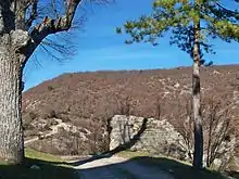 The term grange (barn) in this area refers to an isolated farm: this toponym is present in La Grange (at the northern border of the commune), also at La Grange (outside the village), and in Les Granges de Dauban.[18] The hill overlooking the village is called Le Défens: this is an area, owned by the lord or the community, where herds were banned.[18] Le Clos de Gardon is a cultivable area where the material from road ballasting was used to enclose the fields and meadows with a dry stone wall.[18] Les Chastellas was a fortification at high altitude[18] (which has been confirmed by excavations, see below) and La Tuilerie was a tile production workshop prior to the 18th century (before the term tuilière was used).[18]