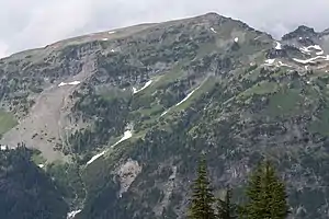 Banshee Peak is a 7,400+ ft summit located in Mount Rainier National Park in Pierce County of Washington state. As part of the Cascade Range, Banshee Peak is situated west of the Cowlitz Chimneys and east of Panhandle Gap, with the Sarvant Glacier set below its north cliff. Banshee Peak is a high remnant of bedded Ohanapecosh Formation lava flows.[2] Access is from Panhandle Gap via the Wonderland Trail. The broad summit has alpine tundra similar to that found on Burroughs Mountain. The Sunrise Historic District provides a viewpoint from which to see Banshee Peak when weather permits. The road to Sunrise is only open seasonally in the summer due to closure from snowpack.