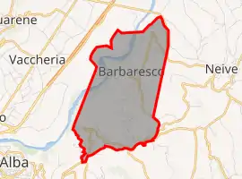 Barbaresco is a comune (municipality) in the Province of Cuneo in the Italian region Piedmont, located about 50 kilometres (31 mi) southeast of Turin and about 60 kilometres (37 mi) northeast of Cuneo. As of 31 December 2004, it had a population of 656 and an area of 7.6 square kilometres (2.9 sq mi).[3] The commune is principally known for its homonymous medieval tower, constructed between the 12th and 14th centuries, and its production of wine bearing the same name.