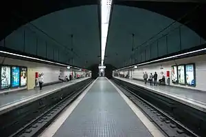 A total of 34 railway stations are situated along the line, all of which are disabled-accessible, with the exception of El Putxet, Sarrià and Peu del Funicular stations.[15] 19 out of 34 stations are underground, while the rest are at-grade,[10] and 6 out of 34 are transfer stations.[15] The opening of the extension of the Sabadell branch will suppose the incorporation of 5 new underground stations, one of which will be a transfer station to the Rodalies de Catalunya commuter and regional rail system.[14]