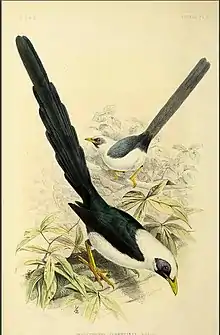 The bare-eyed myna (Streptocitta albertinae) is a large, long-tailed species of starling in the family Sturnidae. Its common name is a reference to the large patch of dark bare skin around the eyes. Due to its superficial resemblance to a magpie, it has been referred to as the Sula magpie in the past. It is endemic to tropical open lowland forests on the Indonesian islands of Taliabu and Mangole in the Sula Islands. It is threatened by habitat loss.