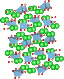 The solid has two known phases: a low-temperature (β) phase with P21/n symmetry[1] and a high-temperature (α′) phase with P21nb symmetry.[2] The structure of Ba2TiO4 is unusual among the titanates because its titanium atoms sit in a four-oxygen tetrahedron rather than a six-oxygen octahedron.[1][3]