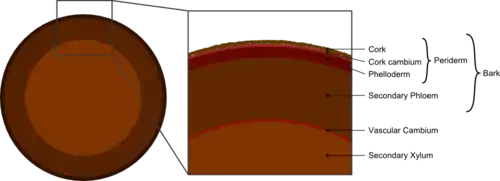 In woody plants, the epidermis of newly grown stems is replaced by the periderm later in the year. As the stems grow a layer of cells form under the epidermis, called the cork cambium, these cells produce cork cells that turn into cork. A limited number of cell layers may form interior to the cork cambium, called the phelloderm. As the stem grows, the cork cambium produces new layers of cork which are impermeable to gases and water and the cells outside the periderm, namely the epidermis, cortex and older secondary phloem die.[9]