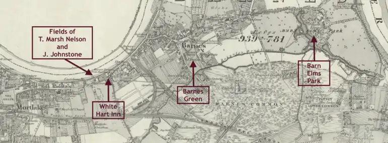 A Barnes Cricket Club, playing on Barnes Green, is recorded from 1835.[2] In rowing, the Barnes and Mortlake Regatta took place in 1853, and annually from 1857. Barnes FC founder Ebenezer Morley took part in the 1858 and subsequent regattas, and served as the regatta's treasurer in 1860 and secretary from 1862.[3][4][5] The regatta was organized from the White Hart public house, the same address subsequently used by the football club.[6] According to an 1870 newspaper article, Barnes FC was "generally considered as an offshoot of the London Rowing Club".[7] According to Barnes FC (and Football Association) secretary Robert Graham, the members of Barnes FC were "recruited from the rowing element and the noted army cramming establishments of Messrs. Baty and Inchbald". Graham added that "J. Johnston, the owner of Pretender, ... plac[ed] his field, opposite his residence, Castelnau House, at its disposal for matches and the club's athletic sports".[8]