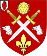 ![]() ![]() Escutcheon: Gules two Swords in saltire Argent hilted and pommelled Gold the points downwards between in chief a Sun in Splendour in base a Fleur-de-lis Or and in fess two Wolves' Heads erased of the second; Crest: Issuant from a Coronet of Fleur-de-lis Or a Demi Wolf Argent gorged with an Eastern Crown Gold supporting with the dexter paw a Lance proper thereon a Pennon per fess Gules and Argent; Supporters: Dexter: a Grey Charger in review order; Sinister: a Springbok, both proper[1] | |