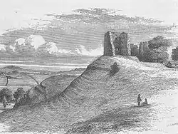 The 40-foot-high (12 m) tower castle of Giffen lay near to the existing Mains of Giffen site on the 180-foot-high (55 m) summit of a whinstone trap ridge at (NS 37727 50718). MacGibbon and Ross[6] suggest that Giffen Castle was built in the 15th century, although the 13th-century (1233)[7] land grant to Walter de Mulcaster, and the prior existence of a chapel, suggest that a defensive structure of some sort was present at that date. At the time of Pont's survey (J Dobie 1876), it was a tower 30 ft (9.1 m) square, 40 ft (12 m) high, with walls 6 ft (1.8 m) thick. It fell into disrepair soon after 1726 and finally collapsed in 1838. It has also been recorded as 'Griffen' on some old maps of the district.