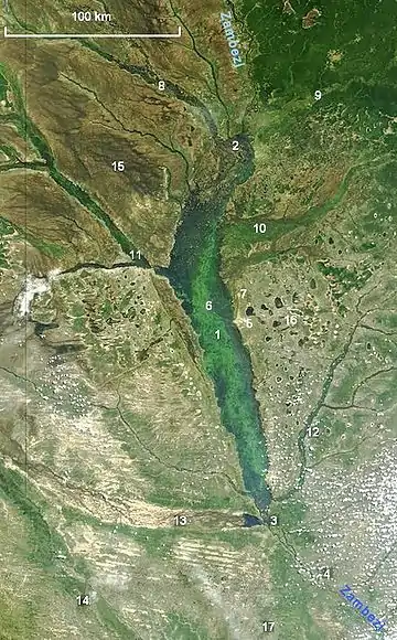 The floodplain stretches from the Zambezi's confluence with the Kabompo and Lungwebungu Rivers in the north, to a point about 230 km south, above the Ngonye falls and south of Senanga. Along most of its length its width is over 30 km, reaching 50 km at the widest, just north of Mongu, principal town of the plain, situated at its edge. The main body of the plain covers about 5500 km²,[4] but the maximum flooded area is 10 750 km² when the floodplains of several tributaries are taken into account,[5] such as the Luena Flats. The Barotse Floodplain is the second largest wetland in Zambia after the Lake Bangweulu system, which differs in having a large permanent lake and swamps, and a much smaller area which dries out annually.[4]