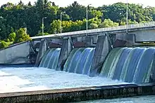 Barrage dams have a series of gates that control the amount of water passing through it. A barrage dam can be used to divert water for irrigation needs or limit the amount of water down-stream. In most cases, a barrage dam is built near the mouth of the river. The site of dam construction needs to be thoroughly investigated to ensure that the foundation is strong enough to support the dam and has low possibility of failing.[2] When dams are created, they are given a safety rating depending on the type of dam, location, and the possible effects in case of failure. The ratings are from one to five, five having the highest danger rating. The rating of five would be given to dams built with a town or city downstream that would have higher possibility of injury to people in the case of dam failure. New designs have been made that are able to sustain greater amounts of water. An improved wedge-shaped block technology was developed by Rafael Moran and Miguel Toledo. The new structure is able to withstand severe flooding and use less materials, reducing the production cost.[3]
