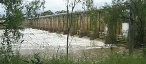 A barrage is a type of low-head, diversion dam which consists of a number of large gates that can be opened or closed to control the amount of water passing through. This allows the structure to regulate and stabilize river water elevation upstream for use in irrigation and other systems. The gates are set between flanking piers which are responsible for supporting the water load of the pool created. The term barrage is borrowed from the French word "barrer" meaning "to bar".[1]