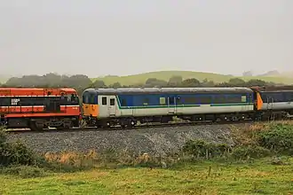 A preserved example of a translator carriage - at the Downpatrick and County Down Railway in Ireland, the former NI Railways DBSO is used to allow a 141 Class diesel locomotive with buffers and chain couplers to haul a 450 Class railcar with tightlock couplers.