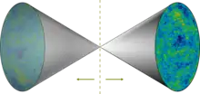The state of universe, as it is, does not violate the CPT symmetry, because the Big Bang could be considered as a double sided event, both classically and quantum mechanically, consisting of a universe-antiuniverse pair. This means that this universe is the charge (C), parity (P) and time (T) image of the anti-universe. This pair emerged from the Big Bang epochs not directly into a hot, radiation-dominated era. The antiuniverse would flow back in time from the Big Bang, becoming bigger as it does so, and would be also dominated by antimatter. Its spatial properties are inverted if compared to those in our universe, a situation analogous to creating electron–positron pairs in a vacuum. This model, devised by physicists from the Perimeter Institute for Theoretical Physics in Canada, proposes that temperature fluctuations in the cosmic microwave background (CMB) are due to the quantum-mechanical nature of space-time near the Big Bang singularity.[14] This means that a point in the future of our universe and a point in the distant past of the antiuniverse would provide fixed classical points, while all possible quantum-based permutations would exist in between. Quantum uncertainty causes the universe and antiuniverse to not be exact mirror images of each other.[15]