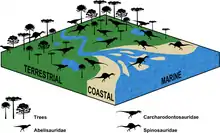 A 2010 study by the French palaeontologist Romain Amiot and colleagues proposed that spinosaurids were semiaquatic, based on the oxygen isotope composition of spinosaurid teeth from around the world compared with that of other theropods and extant animals. Spinosaurids probably spent much of the day in water, like crocodiles and hippopotamuses, and had a diet similar to the former; both were opportunistic predators. Since most spinosaurids do not appear to have anatomical adaptations for an aquatic lifestyle, the authors proposed that submersion in water was a means of thermoregulation similar to that of crocodiles and hippopotamuses. Spinosaurids may also have turned to aquatic habitats and piscivory to avoid competition with large, more-terrestrial theropods.[65] In 2016, Sales and colleagues statistically examined the fossil distribution of spinosaurids, abelisaurids, and carcharodontosaurids, and concluded that spinosaurids had the strongest support for association with coastal palaeoenvironments. Spinosaurids also appear to have inhabited inland environments (with their distribution there being comparable to carcharodontosaurids), which indicates they may have been more generalist than usually thought.[66]