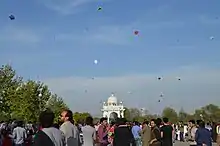 Historically, Maharaja Ranjit Singh held an annual Basant fair and introduced kite flying as a regular feature of the fairs held during the 19th [3] century which included holding fairs at Sufi shrines.[4] Maharaja Ranjit Singh and his queen Moran would dress in yellow and fly kites on Basant.[5] The association of kite flying with Basant soon became a Punjabi tradition with the centre in Lahore which remains the regional hub of the festival throughout the Punjab region.[6] Indeed, Maharaja Ranjit Singh held a darbar or court in Lahore on Basant which lasted ten days during which time soldiers would dress in yellow and show their military prowess.[7] Other traditions of the Basant in Lahore included women swaying on swings and singing.[8]