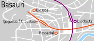 Basauri is the southern terminus of Line 2 of Metro Bilbao. The station is located in the municipality of Basauri, being one of the two stations located in the municipality, part of the Bilbao metropolitan area. It opened in 2011.