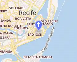 The origin of the location of the Basílica da Penha dates back to a small oratory located "Outside the Gate of Santo Antônio", corresponding, with a slight difference, to the plot of land where today the contemporary building is erected. The oratory was instituted in 1655 by the French Capuchin Franciscans and expanded on April 16 of the same year, in a plot donated by Belchior Alves Camello and his wife Joanna Bezerra. However, the present temple was constructed between the years of 1870 and 1882, being the only church in Corinthian style of the Pernambuco State. It is inspired by the architecture of the San Giorgio Maggiore church of Venice. In 1870, the Capuchins of Veneto (Italy) demolished the old Church of Penha and erected the imposing and current Basilica da Penha, concluding the work in 1882.[5] On September 2, 2007, a restoration work began that lasted until July 4, 2014, the date of its re-inauguration. The works cost about R$ 6 million and have not yet finished.[6] The work of the restorers revealed several features that had been lost by the passage of time. The original color of the gilded saint above the external dome has been restored and a vitrified panel of mosaic made in Italy has been found.[7] The church is known for the traditional event of the Blessing of Felix of Cantalice which took place close to the Basilica while the restoration lasted.[8]