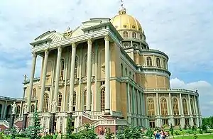 The Basilica of Our Lady of Licheń [ˈlixɛɲ] is a Roman Catholic church located at the Shrine of Our Lady of Sorrows, Queen of Poland, in the village of Licheń Stary near Konin in the Greater Poland Voivodeship in Poland. It was designed by Barbara Bielecka and built between 1994 and 2004.[1] The construction was funded by pilgrims' donations.[2] With a tower measuring 141.5 meters in height,[3] it is one of the tallest and largest churches in the world.