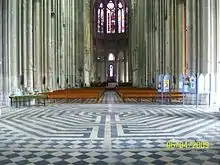 The nave is built to a conventional 12th-century plan with three levels: arcades, triforium and high windows. The great high window is crowned by a magnificent star with five branches. The rich medieval decoration of the interior has been lost.[6] The floor of the nave has an octagonal labyrinth of black and white paving stones from the late 15th century, 260 metres (850 ft) in length. The pilgrim was invited to follow the complex course of black stones before opening his soul to God. One wall of the nave has a half relief stone sculpture of the Tree of Jesse, the genealogy of Christ, from the 16th century.[6]