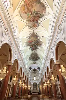 The interior contains 38 frescos by Guglielmo Borremans; in particular the three frescoes on the vault, realized by Borremans in 1735, represent Our Lady's Assumption with the Holy Trinity and the Saints Anne and Joachim, John the Baptist, David and the patriarchs, Cherubs, Angels and Archangels (in the first space),[14] The Virgin's Coronation with the Eucharistic Word in her bosom, the Holy Trinity and Angels (in the second space)[14] and Our Lady the Queen crowned and sitting among the clouds, holding a sceptre with Saint Peter on the right and Saint Paul on the left and male and female saints who founded religious or monastic orders, with Saint Rosalia (in the third space).[14]