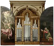 The instrument is equipped with a manual and a hung pedal. The manual has seven split upper keys for subsemitonics (dis/es, gis/as). The organ is housed in a richly carved, gilded Renaissance case which is placed above the choirs in the Cornu Epistulae. The prospectus can be closed by two doors attributed to Fermo Ghisoni and on the outside it shows the holy Saint Barbara and the holy Petrus, on the inside the Annunciation. The disposition is as follows: