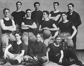The 1899 University of Kansas basketball team, with James Naismith at the back, right.
