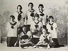 Women's basketball began in 1892 at Smith College when Senda Berenson, a physical education teacher, modified Naismith's rules for women. Shortly after she was hired at Smith, she went to Naismith to learn more about the game.[27] Fascinated by the new sport and the values it could teach, she organized the first women's collegiate basketball game on March 21, 1893, when her Smith freshmen and sophomores played against one another.[28] However, the first women's interinstitutional game was played in 1892 between the University of California and Miss Head's School.[29] Berenson's rules were first published in 1899, and two years later she became the editor of A. G. Spalding's first Women's Basketball Guide.[28] Berenson's freshmen played the sophomore class in the first women's intercollegiate basketball game at Smith College, March 21, 1893.[30] The same year, Mount Holyoke and Sophie Newcomb College (coached by Clara Gregory Baer) women began playing basketball. By 1895, the game had spread to colleges across the country, including Wellesley, Vassar, and Bryn Mawr. The first intercollegiate women's game was on April 4, 1896. Stanford women played Berkeley, 9-on-9, ending in a 2–1 Stanford victory.