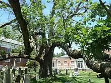 - A Walking Tour of Historic Basking Ridge Village Archived 2016-08-19 at the Wayback Machine, The Historic Society of the Somerset Hills. Accessed July 2, 2016. "Over the tombstones broods the ancient White Oak (Quercus alba), more than 600 years old. It stands tall at 97', with a spread of 156' and a circumference of 18'."