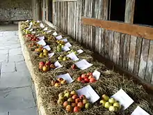 Many varieties exist and are used for making cider. Azkue's dictionary alone, which was printed in 1905, lists more than 80 Basque varieties of apples.[8] Depending on the desired character of the finished cider, different varieties and proportions of apple varieties are used. Some common varieties include: