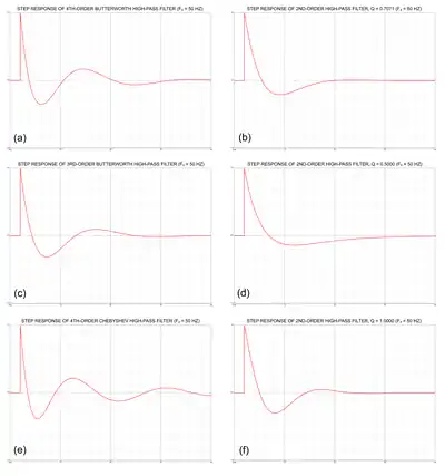 Compared to closed-box loudspeakers, bass reflex cabinets have poorer transient response, resulting in longer decay times associated with the bass notes.[10] Some example step responses for various high-pass filter functions are shown in the relevant figure, where each filter has an identical −3 dB cut-off frequency of 50 Hz. In that figure, (a) represents the step response of a conventional B4 vented box alignment, while (b) represents the step response of a B2 closed-box alignment with Q = 0.7071. The transient response of a vented-box loudspeaker can be improved by choosing a QB3 alignment similar to (c), which results in a more well damped transient response than that produced by the B4 alignment. However, a C4 vented-box alignment similar to (e) results in a less well damped transient response.