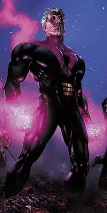 Thanks to Bastion's efforts, both humans and mutants began to experience accelerated mutations through exposure to the Mothervine.[27] A group of mutants, led by Polaris, managed to infiltrate the Mothervine group's hideout once Mothervine was already active, with Bastion detecting their presence and alerting the rest of the group; Bastion incapacitated the daughter of Magneto when she refused Havok's offer to join them, and they were imprisoned as a result.[28] A traitorous Emma, disillusioned by the Mothervine plot, freed Polaris and her team after overseeing an experiment by Miss Sinister on Jimmy Hudson, and they made their way to the inner circle's meeting room. At this point, Magneto had discovered the mutant Elixir, who was capable of reversing the Mothervine mutations and was taken across the world to stop the rampancy, to the notice of Havok and Bastion. Emma and Polaris managed to break into their meeting, and Bastion began fighting them off. Ultimately, he was caught off-guard by the arrival of Xorn, who absorbed him into a wormhole and seemingly destroyed them both.[29]