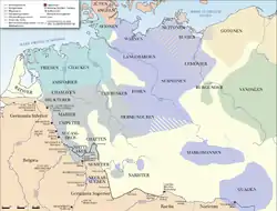 The members of the German Bodyguard were recruited from the West Germanic-speaking tribes resident in, or on the borders of, the Roman province of Germania Inferior, with most recruits drawn from the Batavi[12] but also from neighbouring tribes of the Rhine delta region, including the Frisii,[13] Baetasii[14] and Ubii.[15][16] Little is known about their organisation; from inscriptions it is known that there existed, as in all Roman cavalry units, the officer rank of decurion. The exact size of the unit, which was at least partially mounted, is also unknown, but is described in ancient sources as a cohort, which in this period normally implied a strength of ca. 500 men, or less precisely as a numerus, whose size could vary. Under the Emperor Caligula, the Bodyguard may have consisted of 500 to 1,000 men.