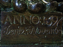 Of the indication of the year, three numbers: 1, 7, and 9, are punched whereas the 5 is engraved. The reason for this is a casting fault underneath, a so-called Lunker, which made the material so thin in this spot that punching in a letter would have created a hole. This Lunker can be seen with the naked eye and has been further proven in the year 2012 by a computer-tomography made by the Fraunhofer Institut (Fürth). In 1996, the renowned art historian Gino Corti wrote: “It is really ANNO 1597, and in the next line it is: 25 Novembe, even if the two 5s are a bit different: for me there is no doubt.”[17] Up until the 18th century, there existed two equivalent forms of the number 5: one with and one without stroke on the top. The use of two different forms of the same number or letter is no rarity in old inscriptions.[18]