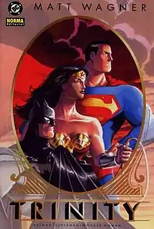 Batman/Superman/Wonder Woman: Trinity is a three-issue comic book limited series published by DC Comics in 2003. Written and drawn by Matt Wagner, the series focused on the first meeting and alliance between DC's Trinity: Batman, Superman, and Wonder Woman,[1] regarded as DC's most popular characters. The story takes place before the formation of the Justice League. The series was collected as a hardback in 2004 and eventually a softcover trade paperback by DC Comics in 2005.[2]