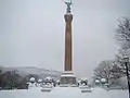 The monument itself was dedicated on 30 May 1897 by surviving American Civil War veterans.[3][4] The monument was financed by monthly contributions from the pay of the officers and soldiers of the Regular Army.[4] The granite column, standing 46 feet (14 m) tall and 5 feet (1.5 m) in diameter,[5] was quarried from Branford, Connecticut,[6] and is reputed to be the largest column of polished granite in the Western Hemisphere.[7] Inscribed on bronze straps belting the eight monumental "cannon balls" circling the column are the names of 2,230 Regular Army officers and soldiers who died for the Union during the Civil War.