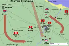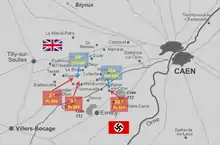 Operation Perch was intended to create the threat of a British break-out to the south-east of Caen by XXX Corps, with the 50th (Northumbrian) Infantry Division capturing the road to Tilly-sur-Seulles.[40] The 7th Armoured Division would then spearhead the advance to Mont Pinçon.[41][42] On 9 June, Montgomery ordered that Caen be taken by a pincer movement.[43] The eastern arm of the attack would consist of I Corps with the 51st (Highland) Infantry Division, which was to cross into the Orne bridgehead and attack southwards to Cagny, 6 mi (9.7 km) south-east of Caen. XXX Corps would form the western arm of the pincer; the 7th Armoured Division would advance south-east and cross the Odon River, to capture Évrecy and Hill 112.[44][45] XXX Corps attacked Tilly-sur-Seulles against the Panzer Lehr Division and part of the 12th SS Panzer Division, which held Tilly despite many casualties on both sides.[46][47][48]