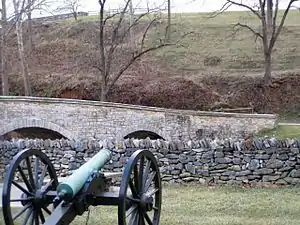 The first two Union divisions arrived on the afternoon of September 15 and the bulk of the remainder of the army late that evening. Although an immediate Union attack on the morning of September 16 would have had an overwhelming advantage in numbers, McClellan's trademark caution and his belief that Lee had as many as 100,000 men at Sharpsburg caused him to delay his attack for a day.[27] This gave the Confederates more time to prepare defensive positions and allowed Longstreet's corps to arrive from Hagerstown and Jackson's corps, minus A.P. Hill's division, to arrive from Harpers Ferry. Jackson defended the left (northern) flank, anchored on the Potomac, Longstreet the right (southern) flank, anchored on the Antietam, a line that was about 4 miles (6 km) long. (As the battle progressed and Lee shifted units, these corps boundaries overlapped considerably.)[28]