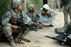 ![]() Soldiers assigned to the 5th Battalion, 20th Infantry Regiment, have a short meeting at an airfield in Baqouba, Iraq before an air assault into an outlying village of the city, 18 June 2007. | |||||||