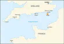 The Battle of Beachy Head (Fr. Battle of Bévéziers) was a naval battle fought on 10 July 1690 during the Nine Years' War. The battle was the greatest French tactical naval victory over their English and Dutch opponents during the war.[2] The Dutch lost six ships of the line (sources vary) and three fireships; their English allies also lost one ship of the line, whereas the French did not lose a vessel. Control of the English Channel temporarily fell into French hands but Vice-Admiral Tourville failed to pursue the Allied fleet with sufficient vigour, allowing it to escape to the River Thames.