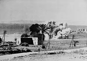 ![]() Vichy shells explode among the Australians as they advance along the coast road south of Beirut | |||||||
