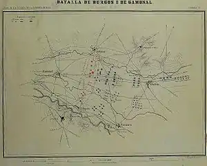 The Battle of Burgos, also known as Battle of Gamonal, was fought on November 10, 1808, during the Peninsular War in the village of Gamonal, near Burgos, Spain. A powerful French army under Marshal Bessières overwhelmed and destroyed the outnumbered Spanish troops under General Belveder, opening central Spain to invasion.[2]
